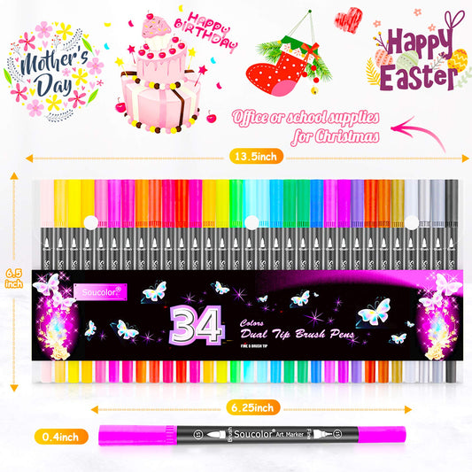 Soucolor Art Brush Markers Pens for Adult Coloring Books, Aesthetic Cute School Supplies, 34 Colors Numbered Dual Tip (Brush and Fine Point) Marker Pen for Kids Note taking Planner Calligraphy Drawing