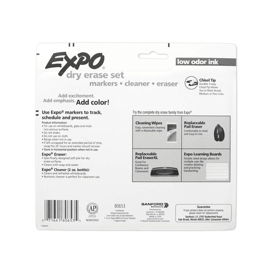 EXPO Low Odor Dry Erase Marker Set with White Board Eraser and Cleaner, Chisel Tip Dry Erase Markers, Assorted Colors, 6 Piece Set with Whiteboard Cleaner