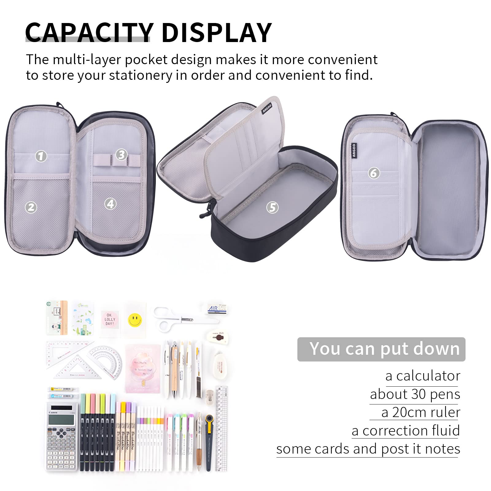 - High Capacity: The dimensions of this pencil bag is about 9.06*4.33*2.56 in (L*W*H); Designed with separate compartments and slots can also keep your small stapler, calculators, art markers, dual brush pens, pastel, highlighters, mini scissors, glue, tape, crayons and charger well-stored