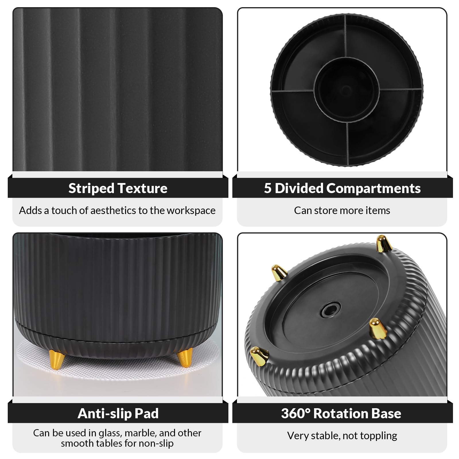 - Space-Saving: The design of 5 compartments provides enough storage capacity without taking up a lot of desktop space. This 5*3.8 inch desk organizer can be placed anywhere in the office, vanity, bathroom, bedroom, and living room