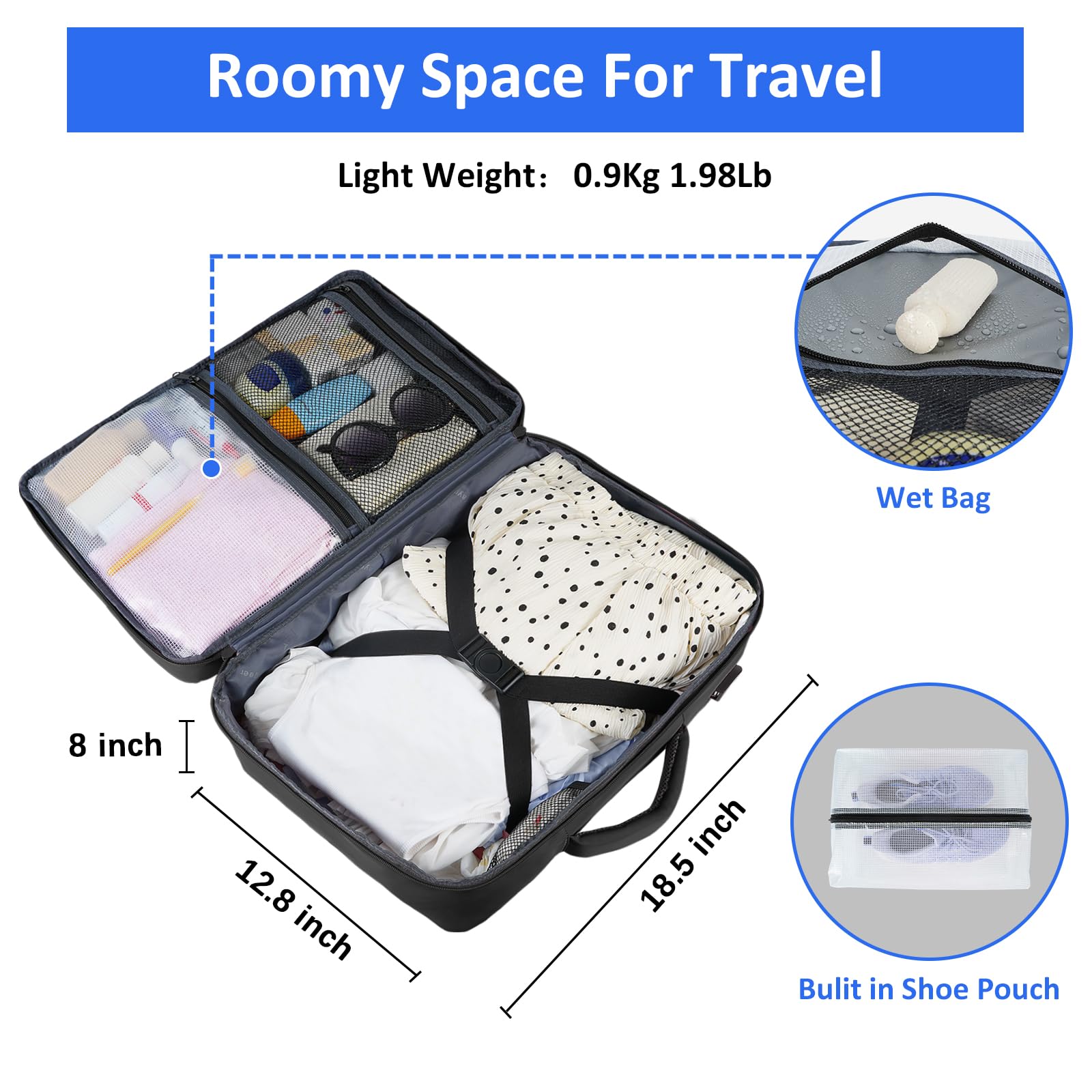 - Roomy Capacity & Multi-Pocket: Dimensions 18.5*12.8*8 inch, Light Weight 0.9 kg(1.98 lb), has 3 main large compartments and 9 allocated inner pockets and side pockets. Makes your item organized and easier to find. College bookbag backpack with laptop compartment holds a 17 inch laptop and a 12.9 iPad, black travel backpack providing a dedicated space for your pen, wallet, clothes, shoes, bottle and other travel essentials. At the same time, travel backpack carry on luggage is water resistant