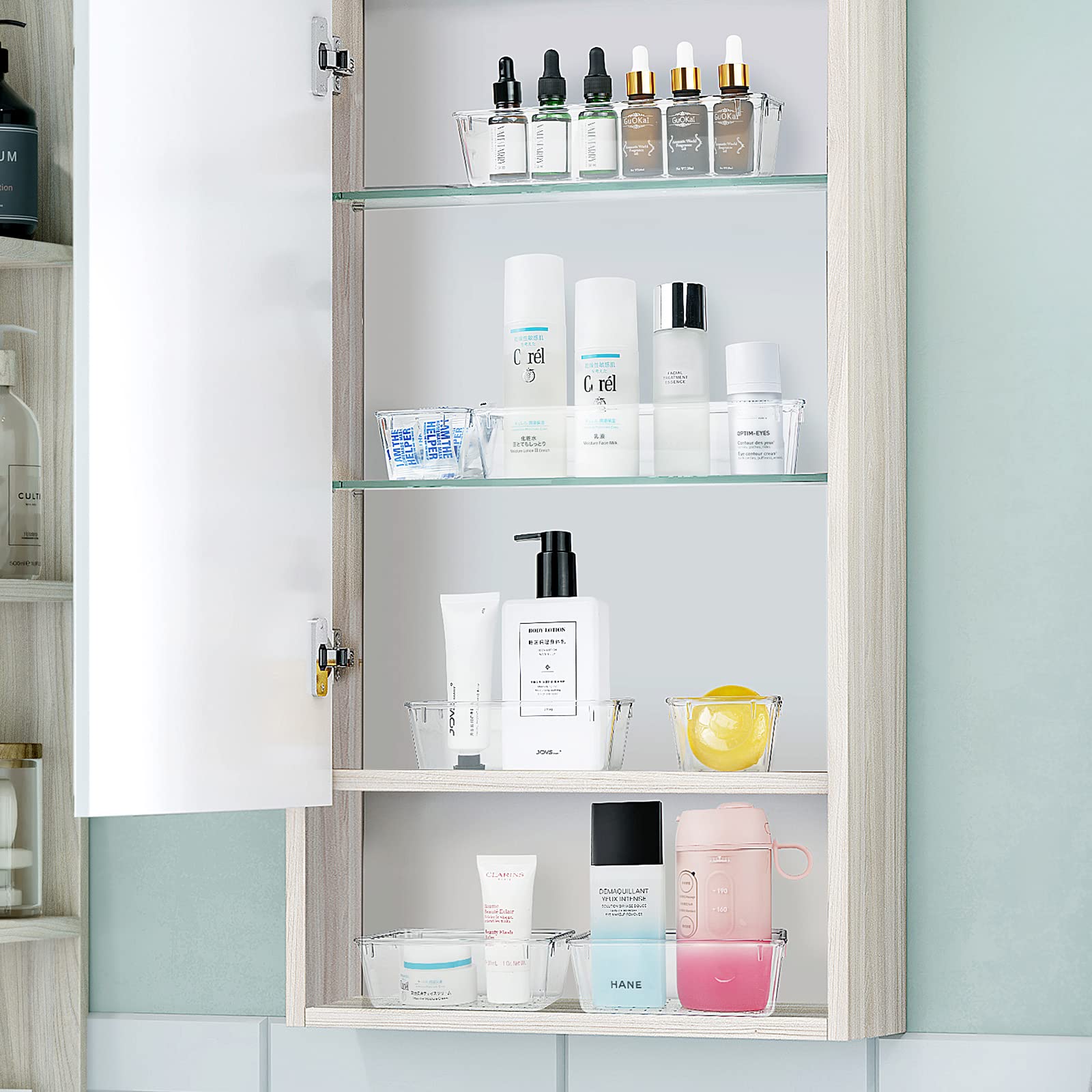 - 4 Combinations of Different Sizes: A set of cabinet organizer includes 25 storage bins of 4 different sizes; includes: 9 x 6 x 1.8 inches (3 pcs), 9 x 3x 1.8 inches (6 pcs), 6 x 3 x 1.8 inches (8 pcs), 3 x 3 x1.8 inches (8 cps)