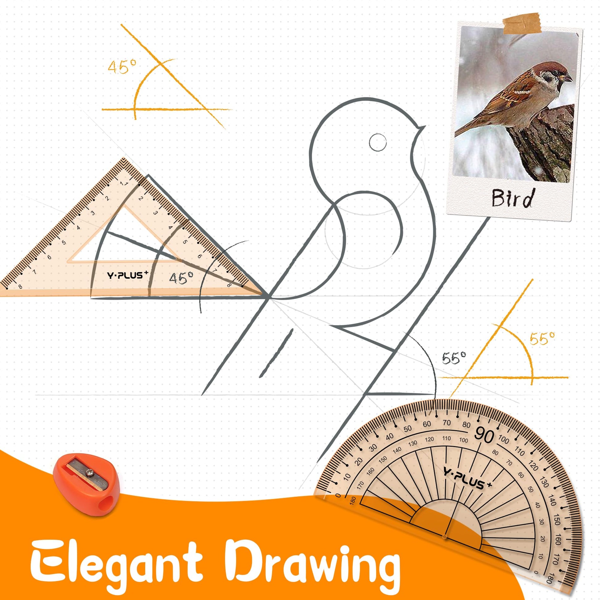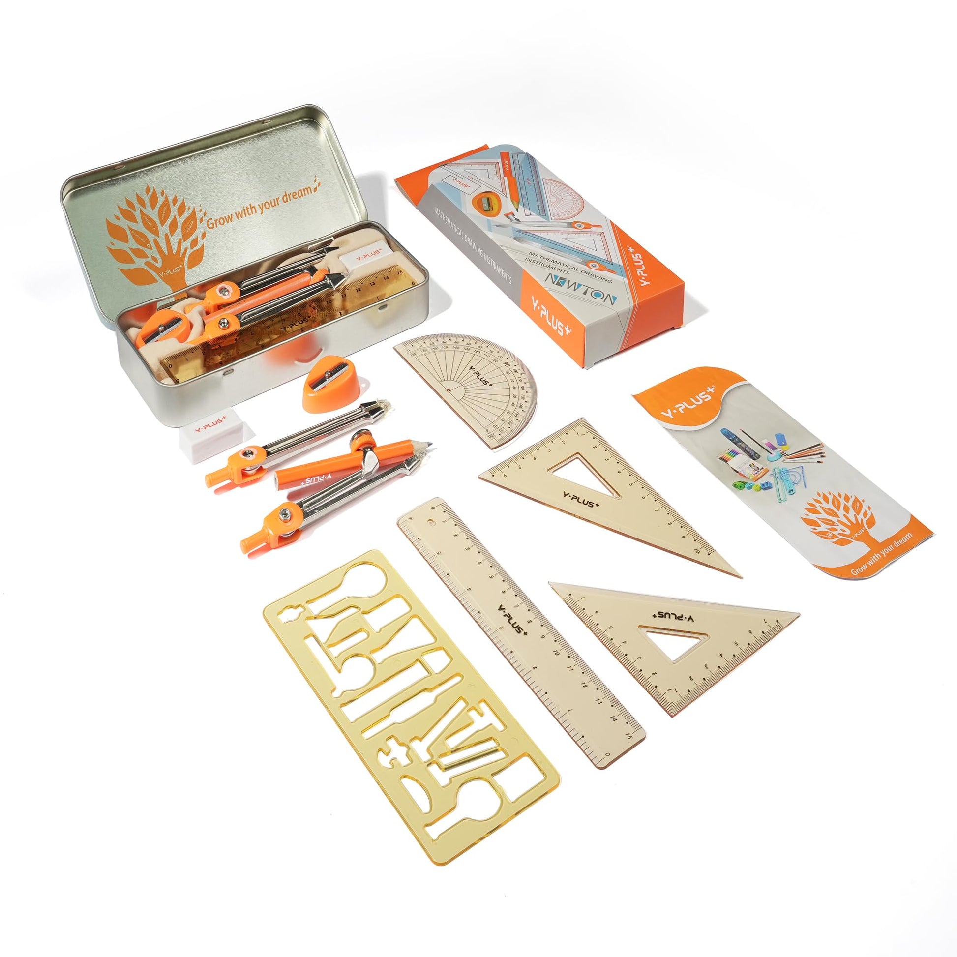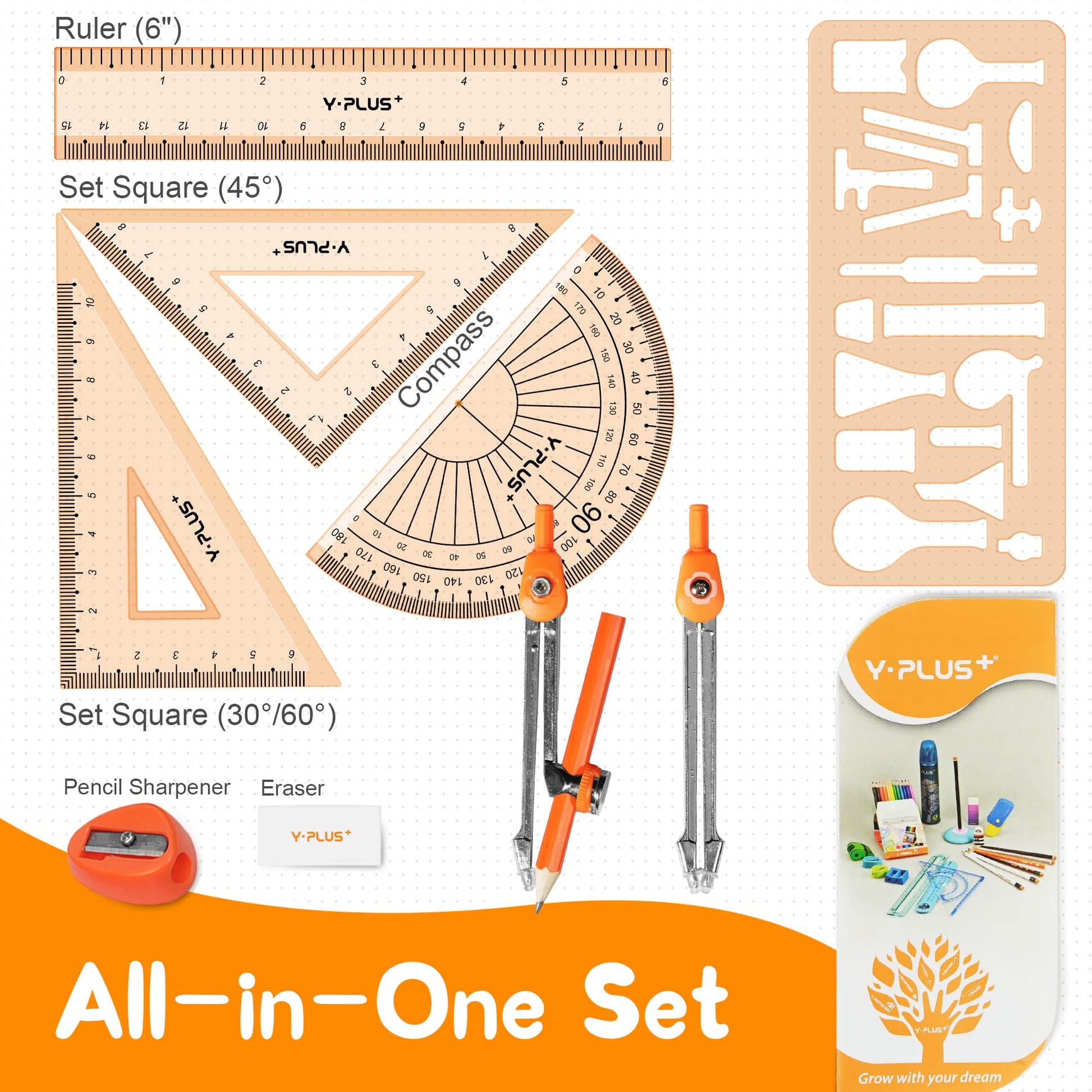 - Package Includes: 1 Ruler (6 inches), 1 Set Square (30°/60°), 1 Set Square (45°), 2 Metal Protractors, 1 Eraser, 1 Manual Pencil Sharpener, 1 Compass, 1 Pencil for Protractor.